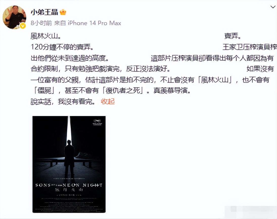 导演王晶发文狠狠吐槽《风林火山》,称“120分钟不停地卖弄”“压榨演员”等侮辱性词汇来形容。