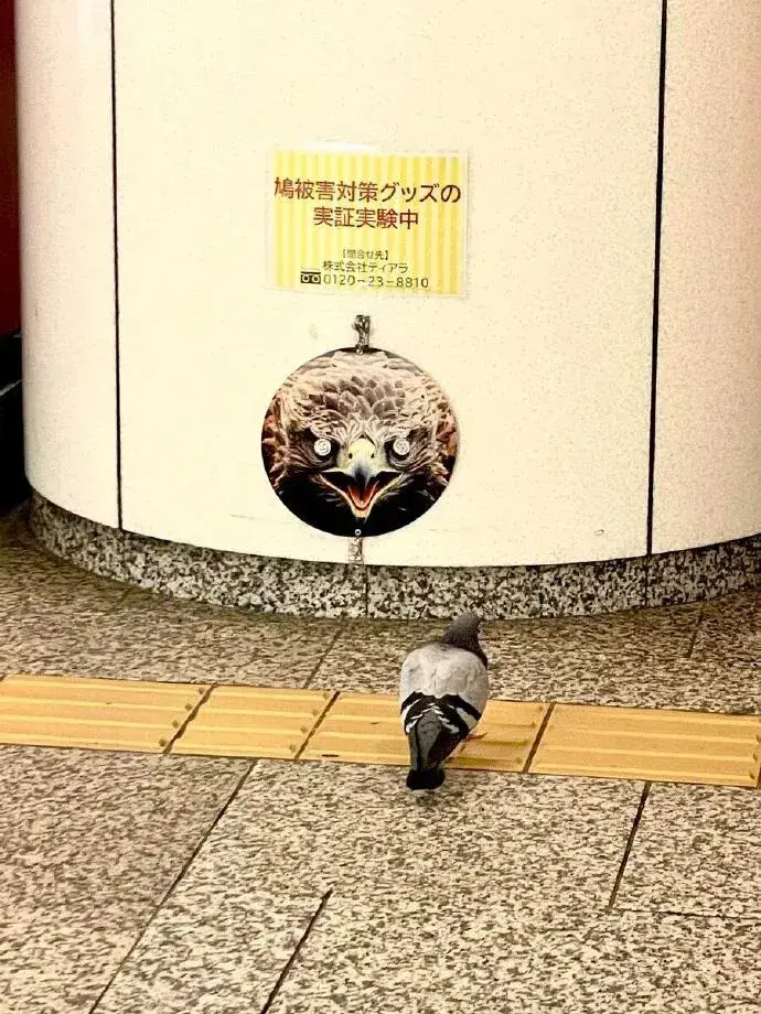 然而,鸽子的适应能力远超人类想象。不到三个月时间,鸽子们就彻底识破了这个“纸老虎”的伎俩。最近日本网友拍到的画面显示,成群结队的鸽子悠闲地坐在猫头鹰海报正下方,表情淡定自若,仿佛在欣赏艺术品。海报上“驱鸽对策实验中”的标语,此刻显得格外讽刺。