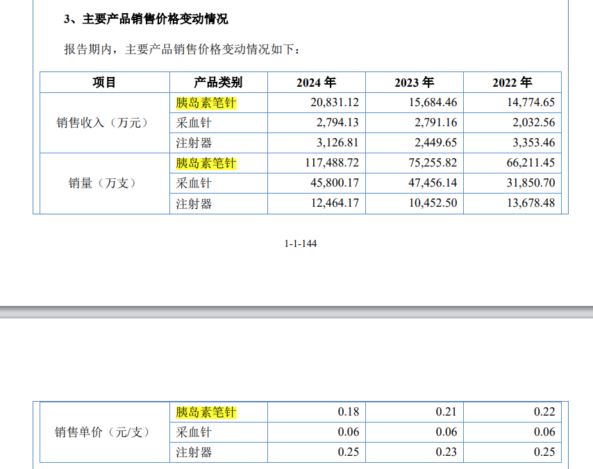 报告期内胰岛素笔针产品是公司销售占比最高的产品类别,2024年该产品销售额占主营业务收入的比重为65.8%。胰岛素笔针产品销售额虽然从2022年的1.48亿元增加至2024年的2.08亿元,但销售单价却是逐年下降宏琳优配,2022-2024年分别为0.22元/支、0.21元/支、0.18元/支。