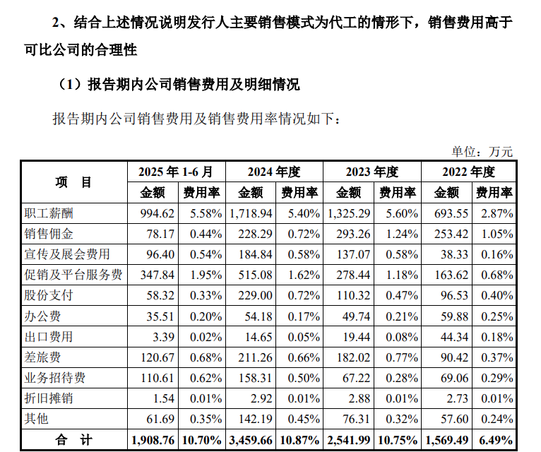这要高于行业均值。问询回复函披露的数据显示,2022-2024年,可比公司销售费用率平均值分别为3.99%、4.41%、4.55%。以2024年来看,采纳股份、华鸿科技、康德莱、五洲医疗的销售费用率分别为2.91%、3.75%、8.59%、2.95%,贝普医疗没有公开披露该数据。