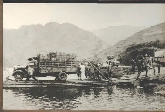 《四库全书》迁徙到重庆青木关时,竹排载文物卡车过河