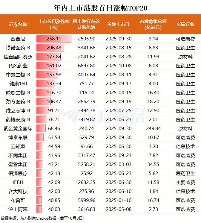 若以行业维度观察,医药生物领域最受追捧,中慧生物、维立志博、药捷安康、劲方医药等4只医药生物类新股,公开发售有效认购倍数均突破千倍,凸显出投资者对创新药企的高度关注与期待。此外,耐用消费品领域的大行科工、布鲁可,消费者服务领域的蜜雪集团,电气设备领域的双登股份等,也引发市场热烈认购。