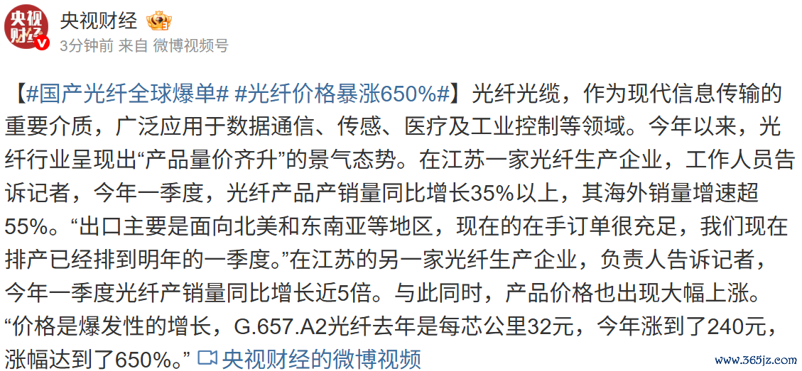国产光纤全球爆单 部分产品价格暴涨650%国产光纤全球爆单 部分产品价格暴涨650%